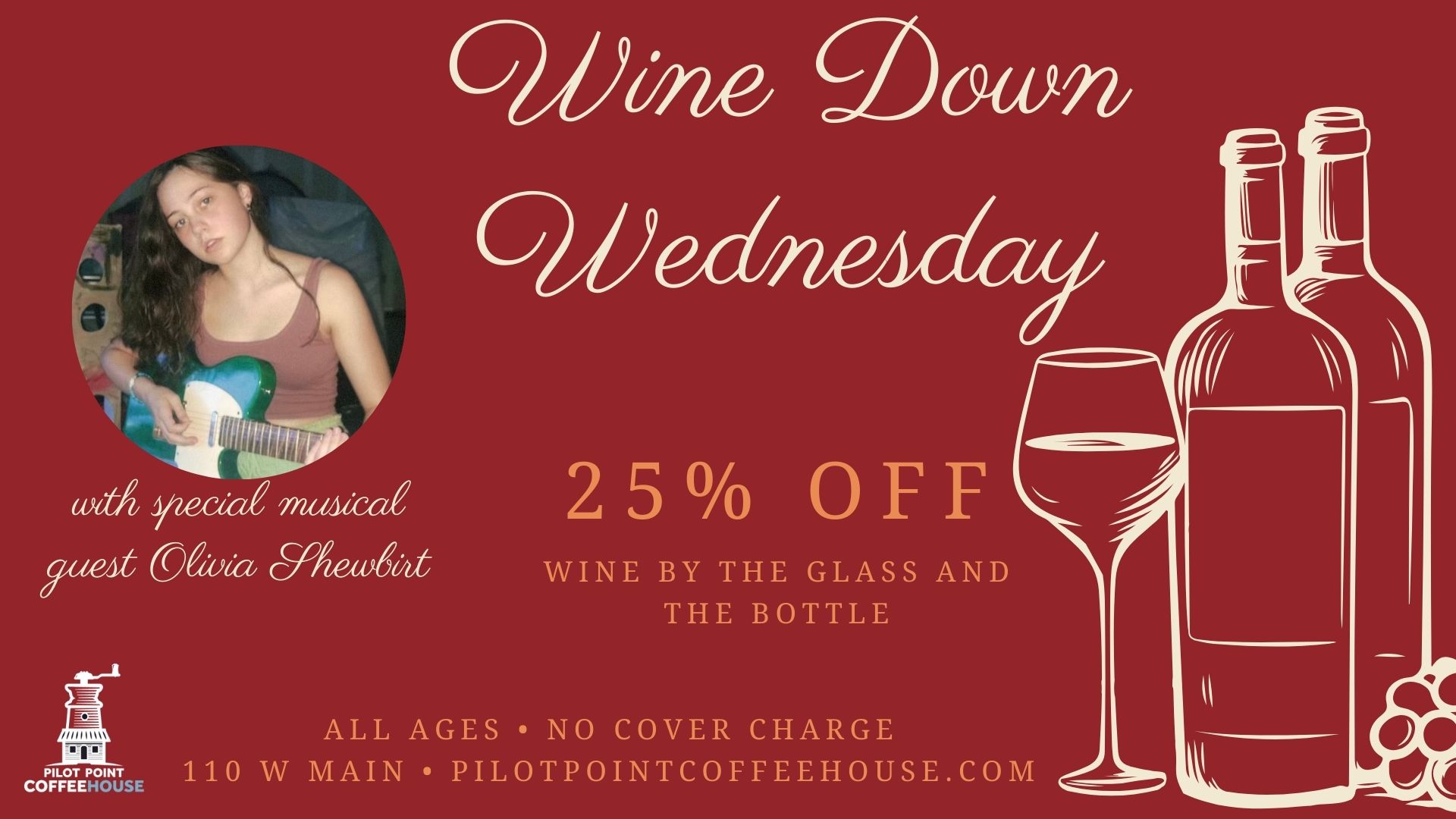 ![]() This week, we have a special guest to entertain you from 7-8 pm while enjoying Wine Down Wednesday! Olivia Shewbirt is proud to call Pilot Point, Texas home, and she recently had the exciting opportunity to act in a film produced right in her hometown. Beyond the screen, she's a natural performer who loves to […] |